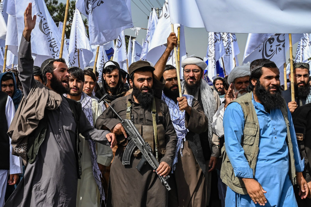 En Islamabad, capital de Pakistán, mujeres afganas completamente cubiertas, salvo por los ojos, sostuvieron pancartas con lemas como “Perdonar a los talibanes es un acto de enemistad contra la humanidad” y “El 15 de agosto es un día oscuro”.
