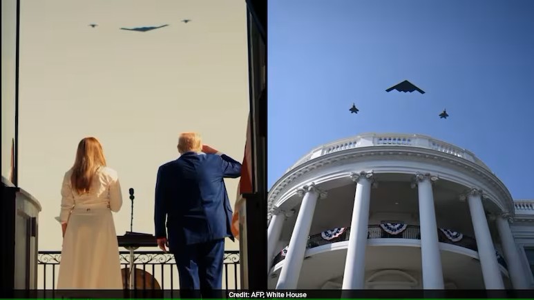 El imponente sobrevuelo incluyó dos B‑2 —el mismo tipo de aeronave que, según se informó, participaron en los recientes ataques a instalaciones nucleares iraníes durante la operación “Midnight Hammer” del 21 de junio, un raid que duró 37 horas y requirió múltiples reabastecimientos en vuelo— escoltados por F‑22 Raptor y F‑35 ‎Lightning II .